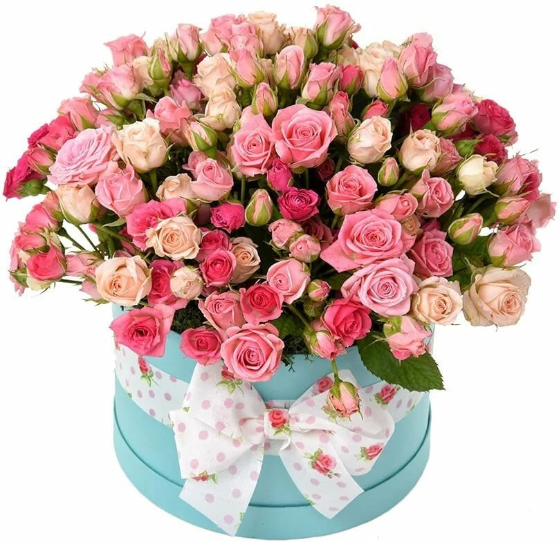 35 кустовых роз, оазис коробка, лента45 кустовых роз, оазис коробка, лента